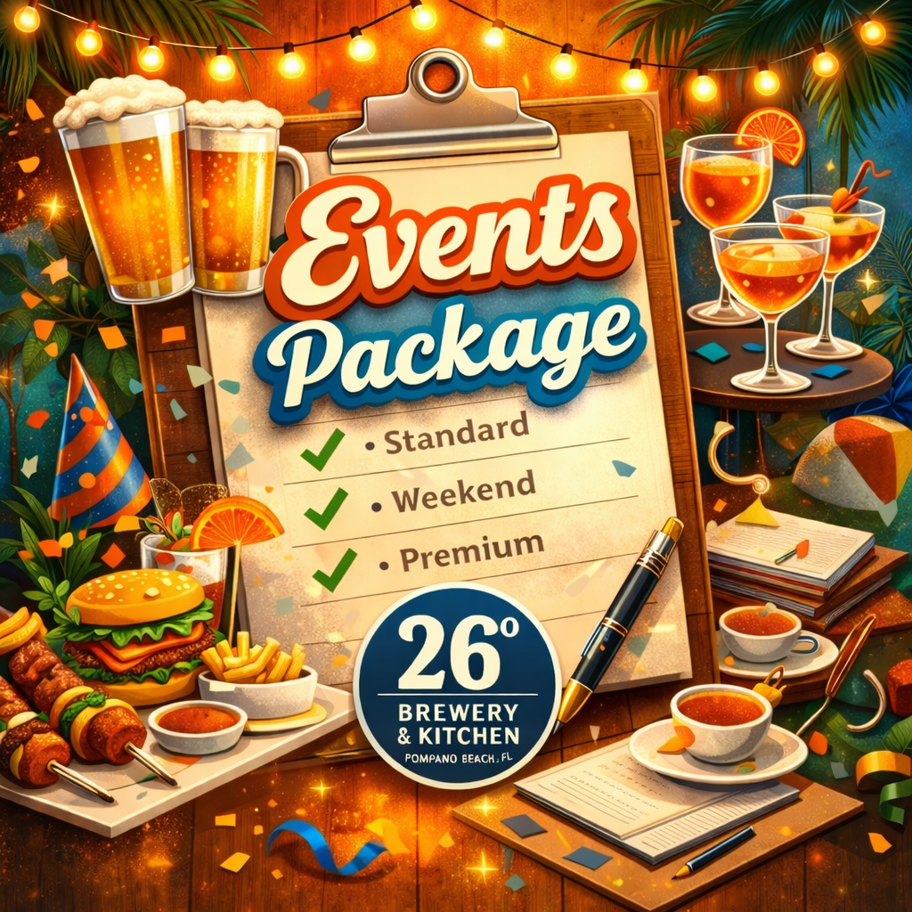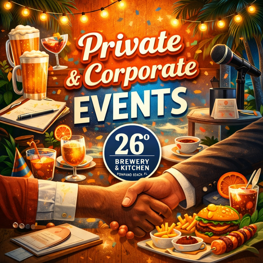 From weekly community nights to private celebrations and corporate gatherings, 26° is designed to be a place where people connect, toast, and create unforgettable memories — all while enjoying craft beer brewed on-site and food made to pair perfectly with every pour.